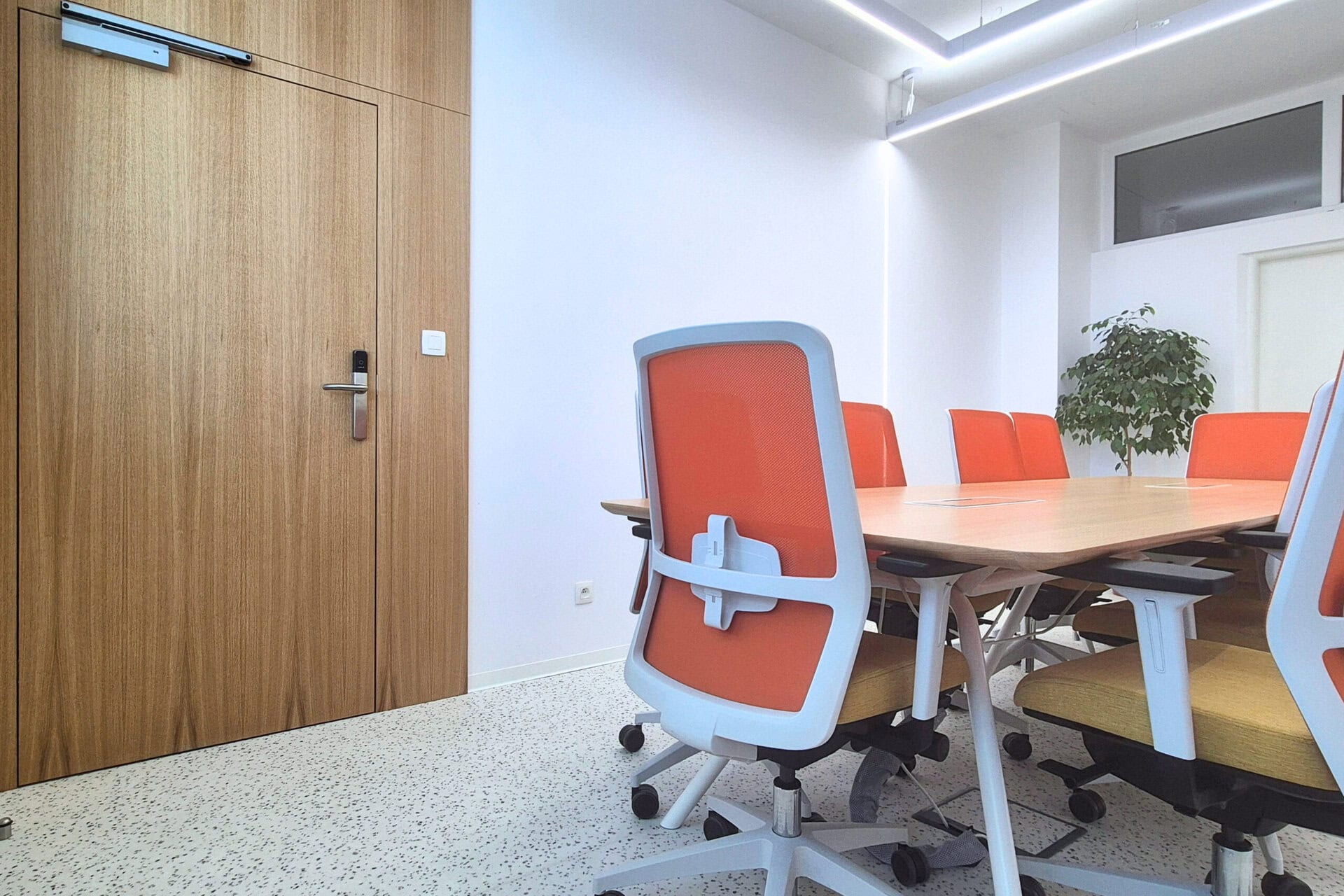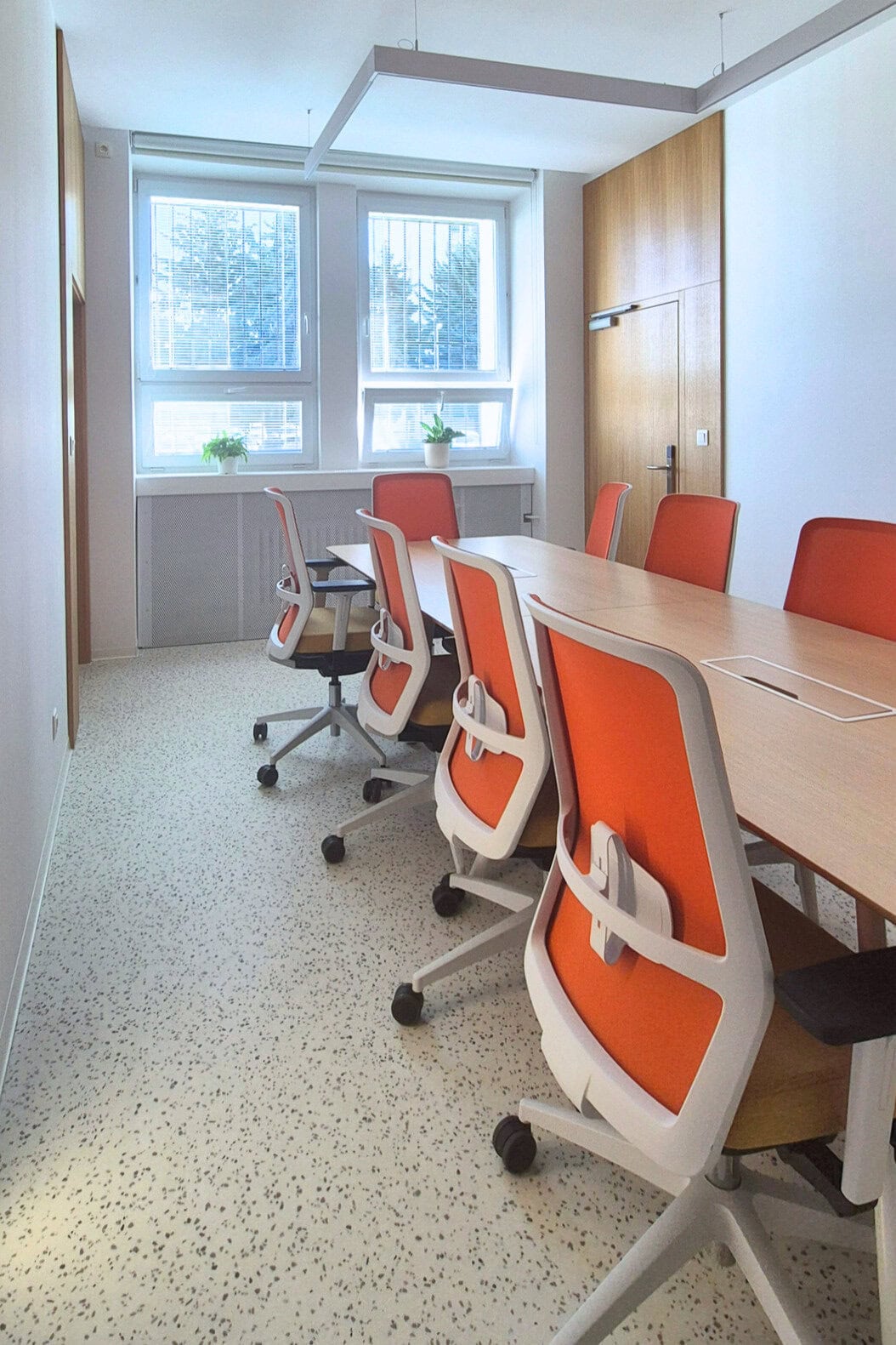 V ďalšej fáze sme zabezpečili dodávku a montáž interiérových prvkov – osadili sme nové interiérové dvere, nainštalovali moderné a zároveň funkčné svietidlá, vrátane zabudovaných dizajnových LED prvkov v stene. Interiér sme doplnili o tieniacu techniku, ktorá umožňuje reguláciu denného svetla a zvyšuje komfort pri práci.